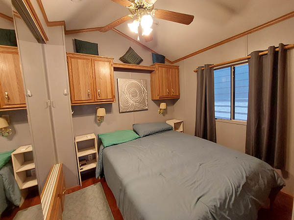 Bedroom has full mirrored closets on the side, more drawers underneath, and at the foot of the bed for clothing and miscellaneous items.